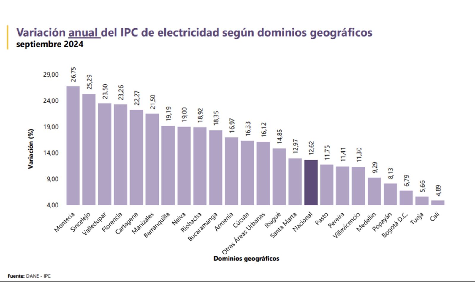 Y es que, según el último reporte de variación anual del Índice de Precios al Consumidor (IPC) presentado por el DANE, Valledupar es la tercera ciudad con mayor índice de inflación por servicios de energía con un 23,50%; solo por detrás de Sincelejo, que se mantiene en la segunda casilla con un 25,29% y Montería, que ocupa el primer puesto con un 26,75%.