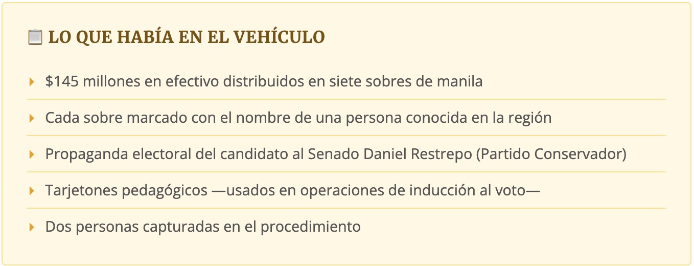 La afirmación resulta, cuanto menos, llamativa. La propaganda de Restrepo no apareció en un basurero ni en una imprenta. Apareció en el mismo vehículo, en el mismo momento, en el mismo procedimiento que los $145 millones. Explicar esa coincidencia requiere algo más que una declaración de buenas intenciones.