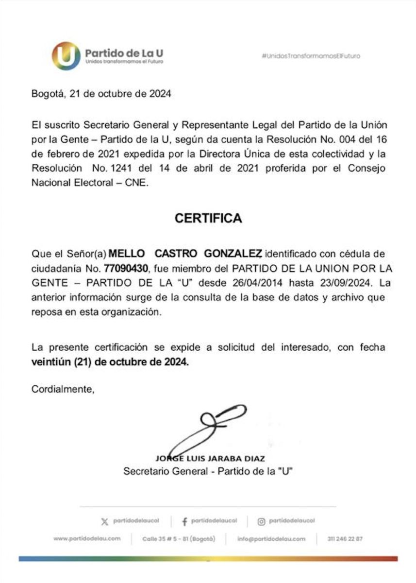 Radio Guatapurí supo, y no es chisme de pasillo, que hay una certificación firmada por el secretario general del Partido de la U, Jorge Luis Jaraba Díaz, con fecha del 24 de octubre de 2024, en la que se confirma que Mello Castro fue miembro de esa colectividad desde el 26 de abril de 2014 hasta el 23 de septiembre de 2024. ¿Qué? Pues, pa’ muchos es claro como el agua: eso suena a “me recogí mis papeles”… y a la U no vuelve.
