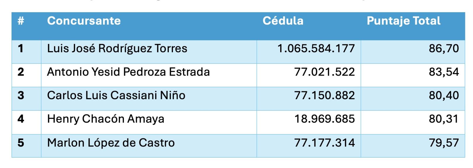 Radio Guatapurí hizo el ejercicio de combinar los dos resultados, teniendo en cuenta el porcentaje de cada una de las pruebas, y obtuvo que, en el primer lugar, aparece Luis José Rodríguez Torres (ex secretario de Educación del Cesar); en segundo lugar, figura Antonio Yesid Pedroza Estrada (docente universitario); el tercer lugar recae en Carlos Luis Cassiani Niño (contador público y actual funcionario de la Contraloría Departamental). Con éstos se conformará la terna donde estarán los tres primeros lugares conforme al puntaje final consolidado.
