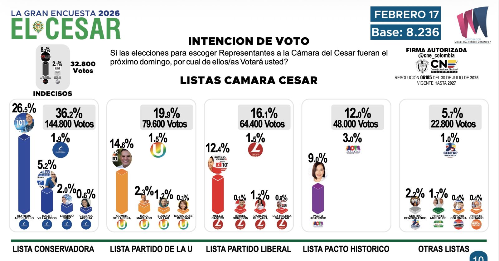 En la consulta sobre intención de voto para la Cámara de Representantes del Cesar, Alfredo Ape Cuello (Partido Conservador) concentra el 26,5% de las preferencias en el total del departamento, posicionándose como el candidato más fuerte a nivel individual. Le sigue Gumer de la Peña (Partido de la U) con el 14,6%, y Mello Castro (Partido Liberal) con el 12,4%.