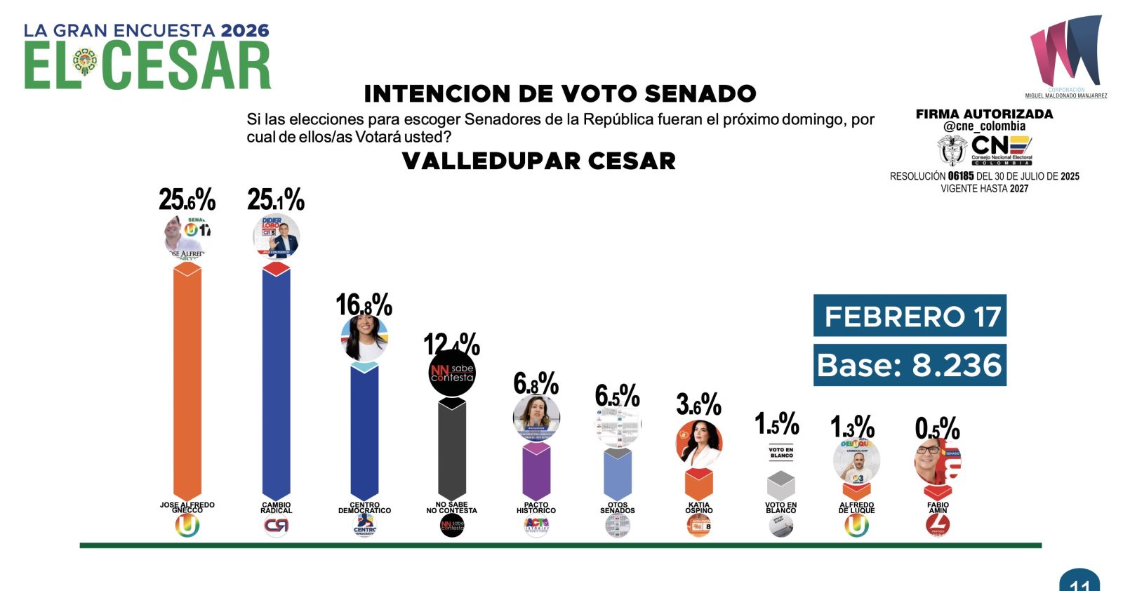 La muestra total fue de 8.236 encuestas distribuidas entre todos los municipios, con una mayor concentración en Valledupar (4.308 encuestas). El margen de error es de ±1,37% para el total departamental, ±1,04% para Valledupar y ±1,62% para los demás 24 municipios, con un nivel de confianza del 95%. El trabajo de campo se realizó entre el 10 y el 17 de febrero de 2026, con 30 encuestadores y validación del 100% de los formularios.
