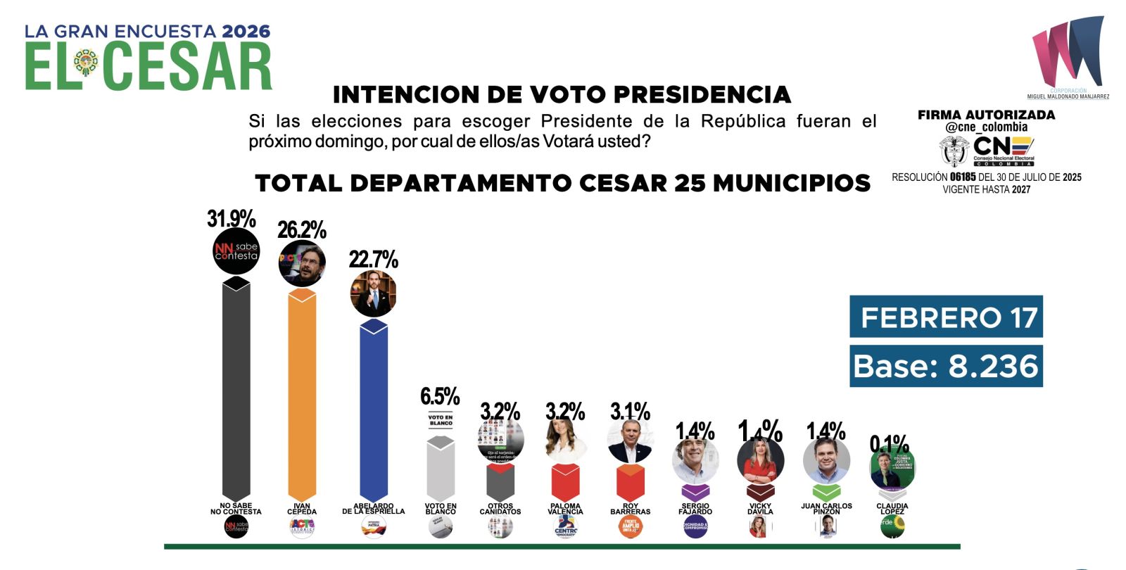 La Gran Encuesta 2026 — El Cesar fue realizada por la Corporación Miguel Maldonado Manjarrez (NIT 900580066), entidad autorizada por el Consejo Nacional Electoral mediante Resolución 06185 del 30 de julio de 2025, vigente hasta 2027. La encuesta es de tipo cuantitativo presencial (CAPI), puerta a puerta, con un universo de hombres y mujeres mayores de 18 años residentes en los 25 municipios del departamento.