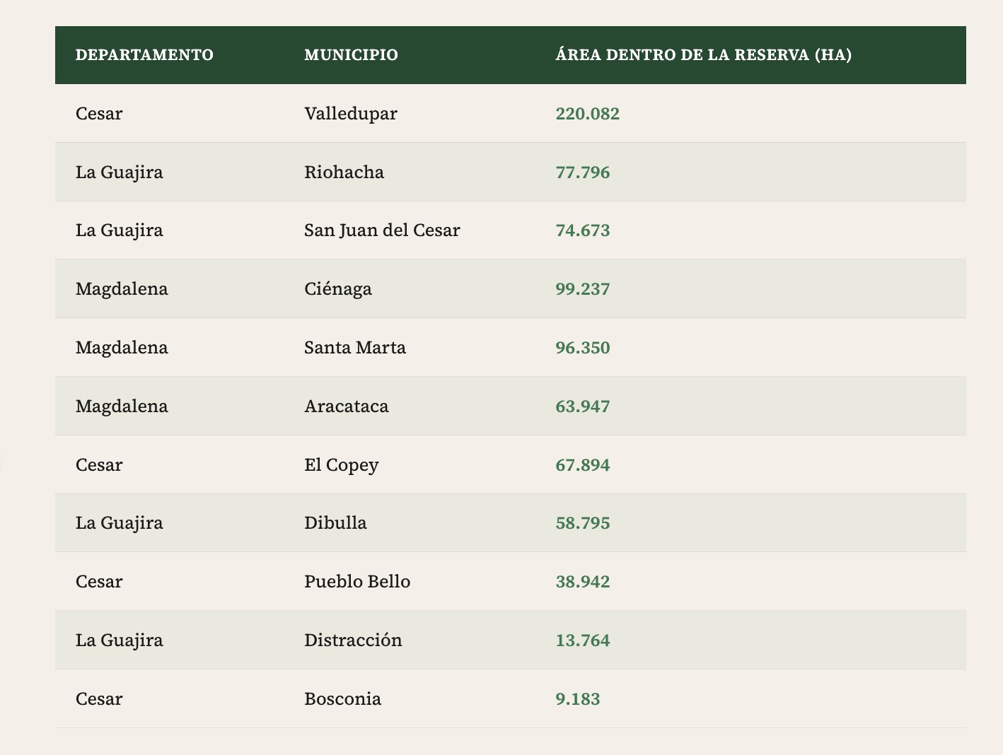 Ahora, con 336.100 hectáreas del departamento bajo protección dentro del área reservada —siendo Valledupar el municipio con mayor superficie afectada, con más de 220.000 hectáreas—, la industria minera del Cesar enfrenta un escenario de restricción sin precedentes en las zonas de piedemonte de la Sierra.