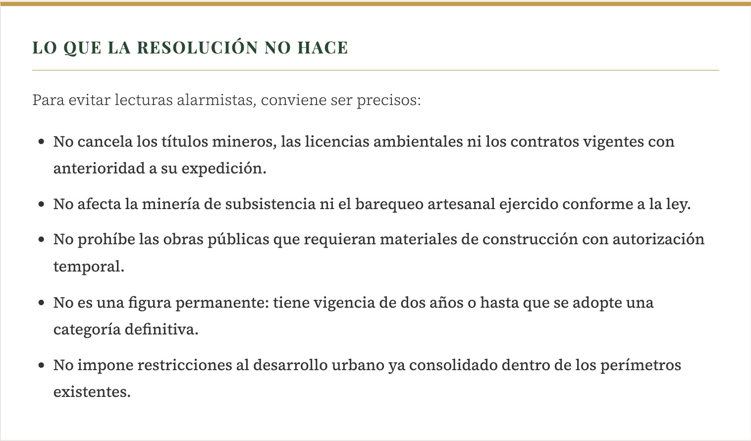 La resolución es cuidadosa en distinguir entre lo existente y lo nuevo. Los proyectos con título minero vigente, instrumento técnico aprobado y licencia ambiental al día pueden seguir operando hasta su vencimiento, sin posibilidad de prórroga ni expansión de área. Los contratos especiales y los procesos de formalización en trámite también se exceptúan. Lo que queda terminantemente prohibido es que la Agencia Nacional de Minería otorgue nuevas concesiones sobre las 942.005 hectáreas declaradas.