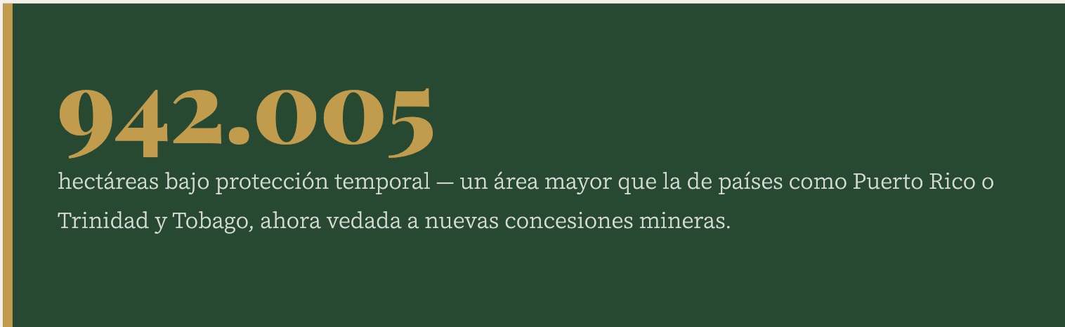 La finalidad de la medida es explícita y urgente: proteger la integridad ecológica, climática, hídrica y biocultural del macizo mientras se diseña una figura definitiva de conservación. La resolución tiene vigencia de dos años —o hasta que se adopte una categoría permanente de protección—, y en ese lapso ningún nuevo título minero, contrato de exploración o explotación podrá ser otorgado sobre el área delimitada.