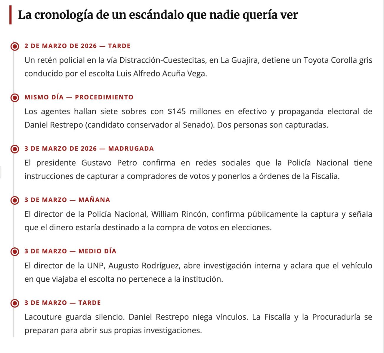 Que un escolta de la UNP aparezca transportando ciento cuarenta y cinco millones de pesos en efectivo, en un vehículo particular, acompañado de propaganda electoral, en época de campaña, en el departamento de La Guajira —epicentro histórico del clientelismo y la compra de votos en Colombia— no es un accidente. Es, como mínimo, una falla institucional gravísima. Como máximo, una complicidad que las autoridades deberán determinar.
