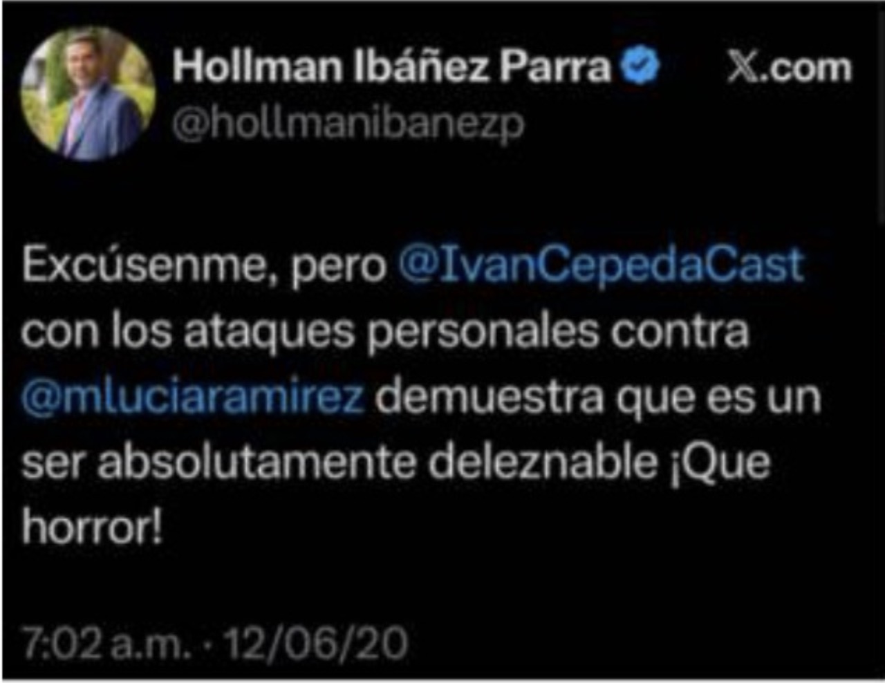 “Excúseme, pero @IvanCepedaCast con los ataques personales contra @mluciaramirez demuestra que es un ser absolutamente deleznable. ¡Qué horror!”