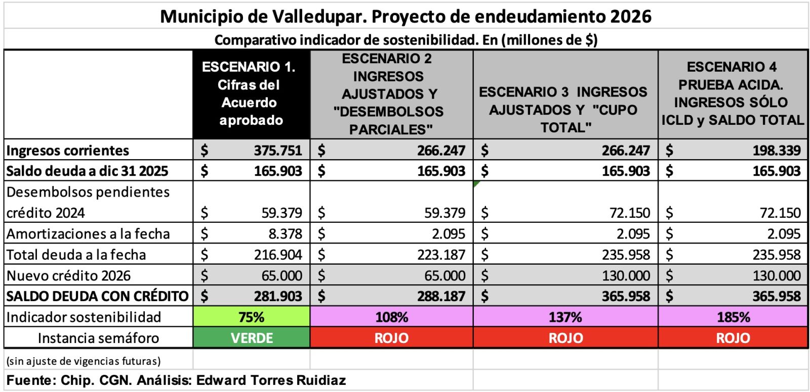 El escenario 4, que llamaremos de prueba acida, es aplicado por algunas entidades bancarias, solo considera los ingresos destinados al pago del crédito, en este caso los ICLD, bajando los ingresos corrientes a $198.339 millones, mucho menos que los $375.771 millones presentados por el alcalde. El indicador se eleva al 185%, semáforo rojo, también ilegal.