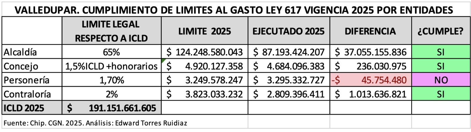 OTRAS DUDAS. LOS ICLD NO ESTÁN TAN LIBRES. El alcalde ofrece para el pago del nuevo crédito los ingresos corrientes de libre destinación que en 2025 fueron de $191 mil millones y financió el 84% de los $122 mil millones de gasto de funcionamiento de todas las entidades de Valledupar, incluido el Concejo Municipal. Con el excedente se pagaron los préstamos bancarios anteriores por $7 mil millones y los $87 mil restantes financiaron proyectos como el transporte y la alimentación escolar ($23 mil millones en educación), acueductos, victimas, entre otros.
